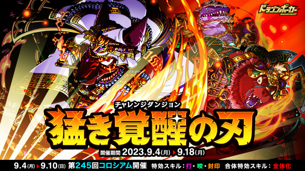 株式会社アソビズム(本社:東京都千代田区、代表取締役:大手智之)は、App Store・Google Playにて好評配信中のリアルタイム合体カードバトル『ドラゴンポーカー』で、2023年9月4日(月)より復刻チャレンジダンジョン「猛き覚醒の刃」を開催いたします。