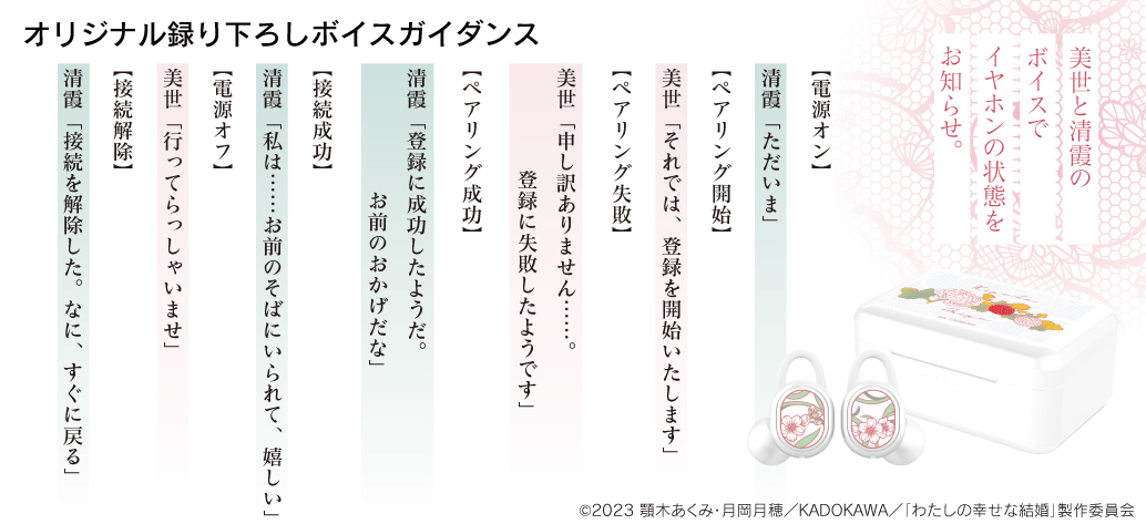 本コラボレーションモデルは、左右ハウジングに作品のタイトル柄でもある「桜模様」を施し、充電ケース天面には「櫛の柄」を施す事により作品の世界観を表現したオリジナルデザインとなっております。尚、お守り柄のちりめん風巾着ポーチを付属、オリジナルデザインパッケージに、「斎森美世」「久堂清霞」による音声ガイダンス搭載(掛け合いボイス)のコラボレーションモデルとなっております。