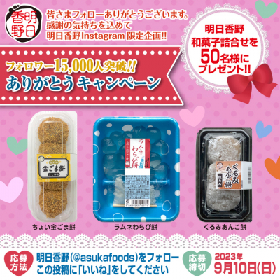 Instagramフォロワーが15,000人を突破した感謝の気持ちを込めまして、「明日香野Instagramフォロワー15,000人突破!!ありがとうキャンペーン」を9月4日より開始しました。