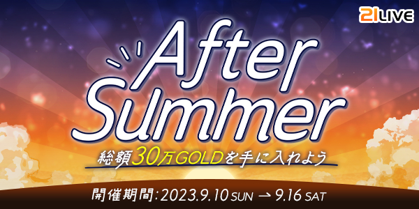株式会社エムアンドティーティー(本社:沖縄県北谷町、代表取締役:井藤 三知子)が運営するエンターテイメント・ライブ配信アプリ【21LIVE(ニーイチライブ)】URL: https://21.live では、9月10日(日)から9月16日(土)にかけて最大300,000GOLDがもらえるライバーイベント・After Summerギフトランキングを開催いたします。