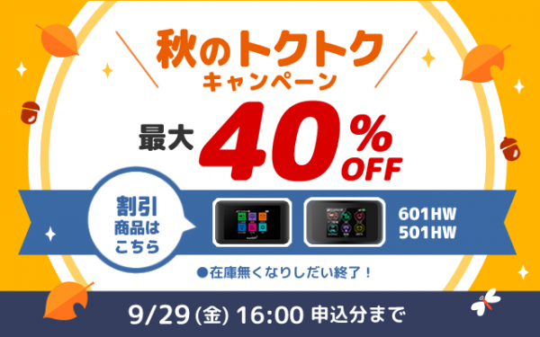 一度、「Wi-Fiレンタル」を試してみたかった方、毎月の通信制限にお困りの方、サービスを利用したことがあるが価格などに満足していない方、今秋の国内旅行を検討されている方など、「Wi-Fiレンタル」をお得に利用できる「秋のトクトクキャンペーン」を、ぜひこの機会にご利用ください。