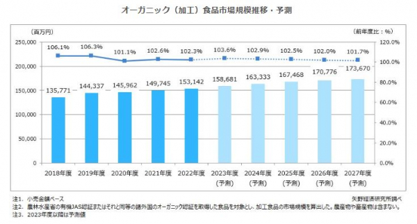 国内のオーガニック食品市場は、2018年度から2022年度までのCAGR(年平均成長率)が3.1%で成長し、2022年度市場規模(小売金額ベース)を前年度比2.3%増の1,531億4,200万円と推計した。
