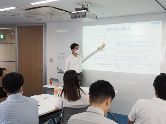 今年2月、部長・営業所長17名、課長・サブリーダー16名を対象に研修を実施。そこで得られた参加者からのフィードバックをもとに、さらなる改善を行い、各半日の全2回にするなど開催方法も工夫し、係長・主任40名を対象とした研修を実施しました。7月に行った前編研修では原因分析の考え方を紹介。指定図書の読書を事前課題とし、8月の後編にてケーススタディを取り入れた実践演習を行いました。