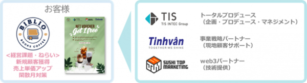 今回の実証実験ではTISが全体の企画運営を行い、スタートアップ企業であるSUSHI TOP MARKETING株式会社の「NFT One Shot」を使用して、TISの出資先であるTinhVan Technologies JSC.のサポートの下、ベトナムのハノイにあるBiblioCafeにてNFTを活用したクーポン施策を行いました。各社がすでに保有している知見・技術・サポート体制を組み合わせて共創し、3社共同での事業企画議論開始からカフェでの実証実験まで約2か月という短期で行いました。