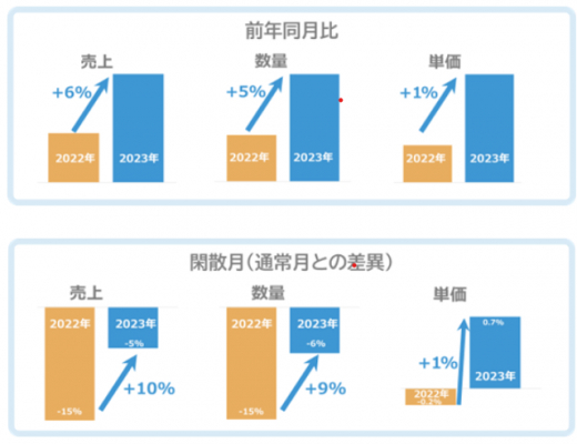 施策を実施した7月のBiblio Café全体の売上・販売数量・平均単価は、前年同月比および閑散月と通常月との差異のいずれも改善し、売上は前年同月比で6%アップ、換算月と通常月の差異は10%改善が見られました。