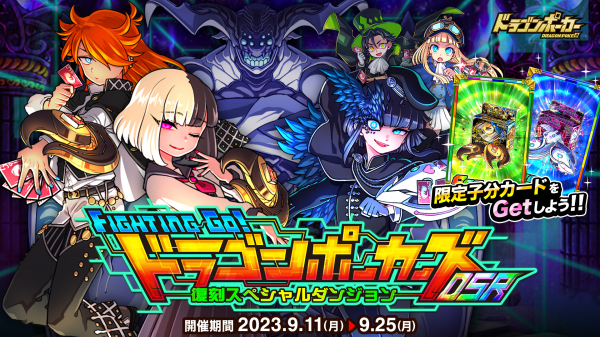 9月11日(月)メンテナンス後より、復刻スペシャルダンジョン「FIGHTING GO!ドラゴンポーカーズDSR」を開催いたします。今回のスペシャルダンジョンでは新たに「須戸ルピオ&二律背反な薫子」「悪魔のマモル」「ディテクティブ・ファントム」が登場!一緒に冒険する仲間と協力し、ダンジョンクリアを目指しましょう!