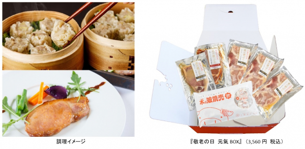 『敬老の日 元氣BOX』は、「米の娘ぶた焼売」(8個入り1パック)と、「米の娘ぶたロース赤ワインみそ漬け」(100g1枚)、「米の娘ぶたロース大吟醸酒粕味噌漬け」(100g1枚)、「米の娘ぶた」の柔らかい部分を厳選したモモ(120g×3PK)で作った味噌漬けをセットにし、元気がでるオレンジカラーのギフトボックスでお届けする、贈り物におすすめの新商品です。
