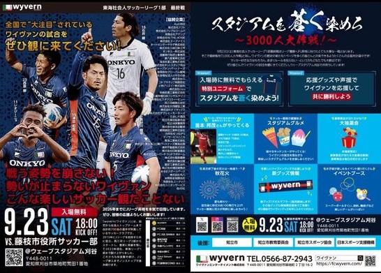 当社は、wyvernの地域貢献活動に賛同し、その活動を応援するため、wyvernに協賛いたします。9月23日(土)には、東海社会人サッカーリーグ1部の最終戦が行われます。リーグ戦優勝・JFL昇格に向けた重要な一戦となります。入場無料ですので、ぜひスタジアムにお越しいただき、今シーズン最後のwyvernの奮闘へのご声援をお願い致します。