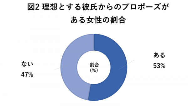 回答者210名のうち、理想とする彼氏からのプロポーズがある女性は53%、対して理想とするプロポーズがない女性は47%みられました。