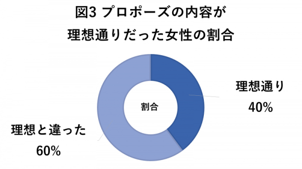 プロポーズが理想通りだった女性は40%と半数にも満たず、プロポーズが理想と違ったという女性は60%を占める結果となりました。