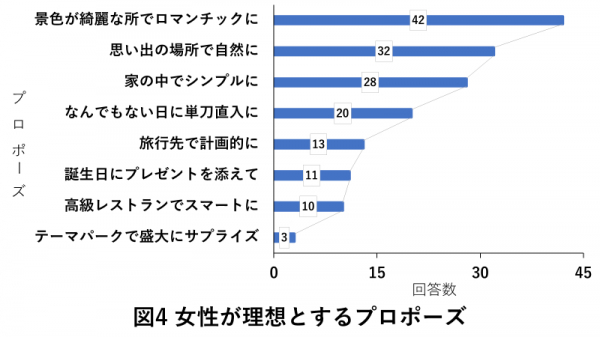 最も理想として多くの回答を集めたのは、「景色が綺麗な所でロマンチックに」。次に「思い出の場所で自然に」というシチュエーションが多く選ばれていました。