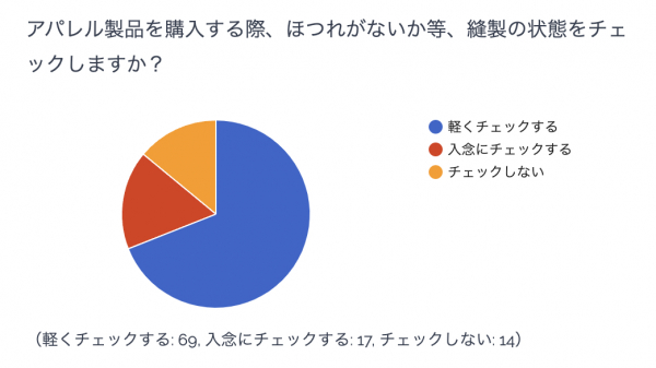 ・できるだけ良い状態のものを購入したいので、縫製はチェックする。ただ、そこまで入念にはチェックしていない。(20代/男性/東京都/正社員)