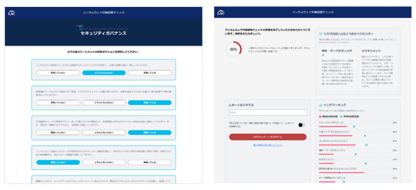 このような状況を受け、ラックは新たに「ランサムウェア対策簡易チェック」の無償サービス提供を開始します。このサービスでは、7つのカテゴリに分かれた25のアンケート形式の質問に回答することで、自組織のランサムウェア対策の充足度を簡単に確認できます。回答後に即時発行される簡易レポートでは、経験豊富なコンサルタントやセキュリティエンジニアたちの監修によるアドバイスに加え、優先的に対応する必要がある課題が示され、具体的に取り組むべき方針を把握できます。