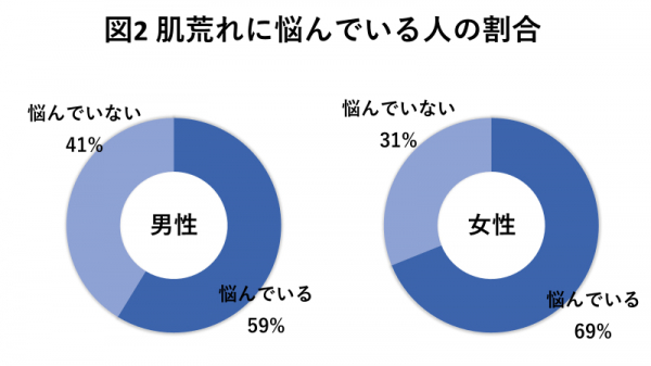 男性は全体のうちおよそ6割、女性はおよそ7割が肌荒れに悩んでいると回答。