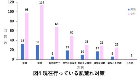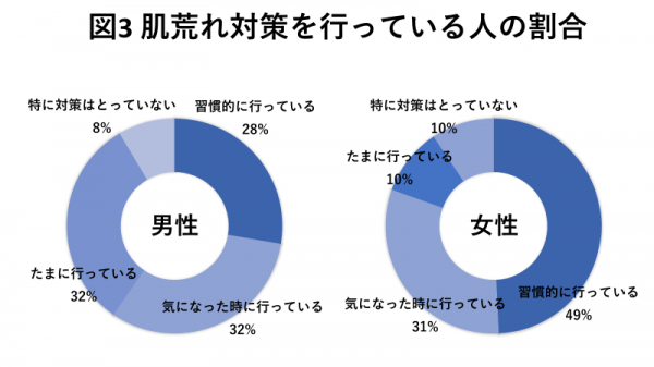 女性の方が肌荒れに悩む割合が高いこともあり、習慣的に肌荒れ対策を行っている割合に関しても女性の方が高い結果となりました。