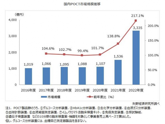 2022年度の国内POCT市場規模(10分野計)は、事業者売上高ベースで前年度比217.1%の3,335億円となった。