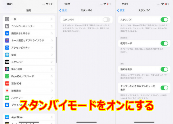 まず、デバイスの「設定」アプリを開きます。次に「スタンバイ」をタップし、「オン」に設定します。