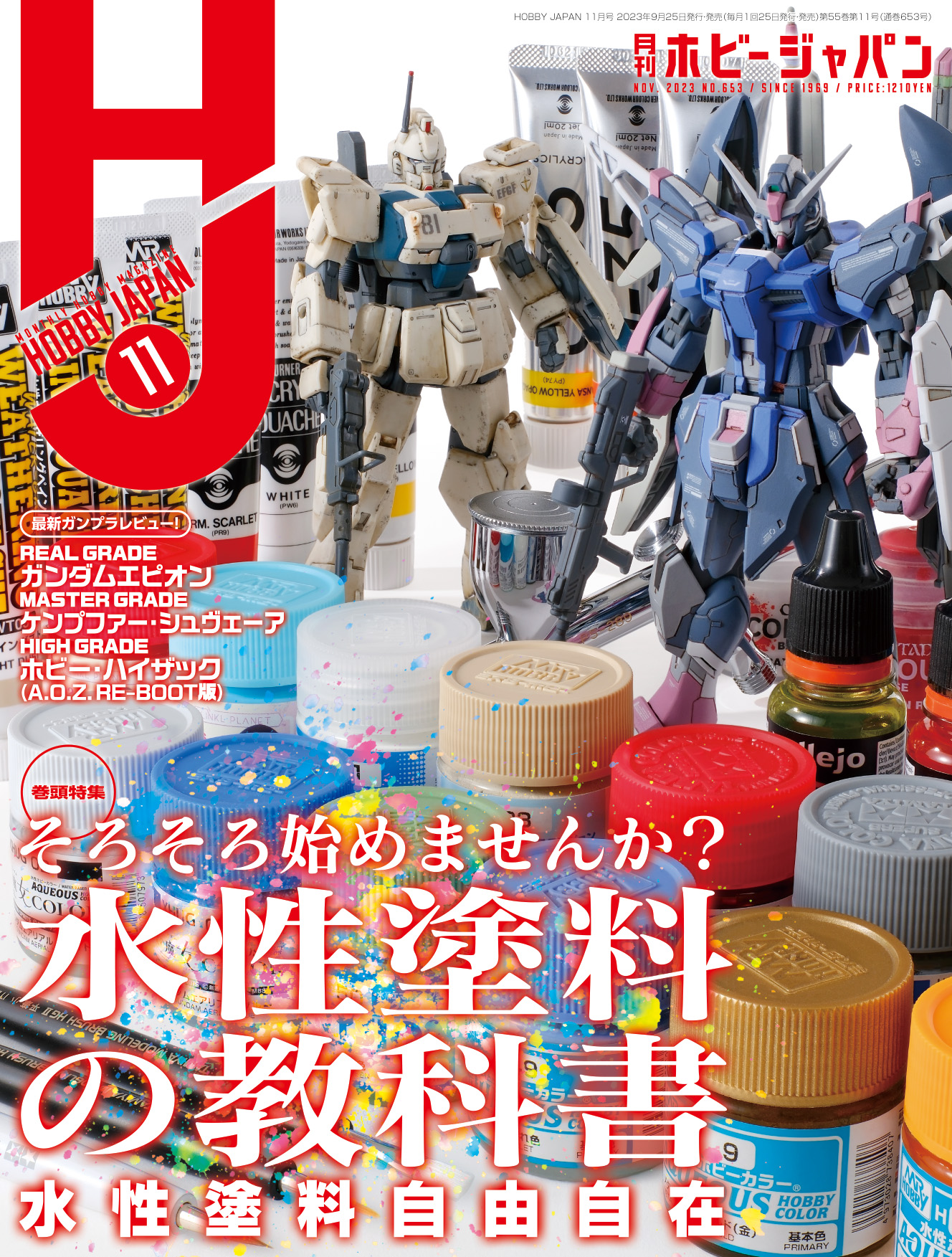 「月刊ホビージャパン 2023年11月号」の巻頭特集は「水性塗料の教科書 水性塗料自由自在」!