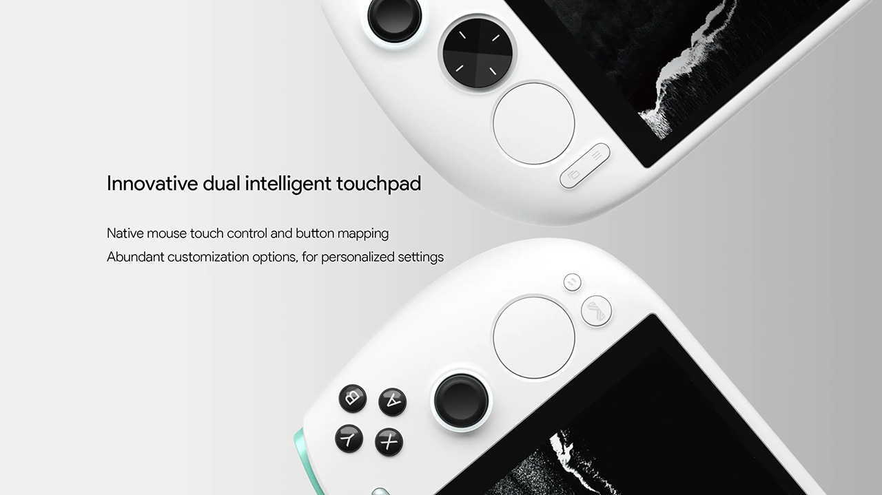 AYANEO初となるタッチパッドを本体左右に2つ搭載。マウス操作やスクロールなどを割り当て、ゲームパッド操作とシームレスに組み合わせることができます。さらにタッチパッドの上下左右は独立したボタンとしても機能するため、各種操作を割り当てることでこれまでにない操作性を実現します。