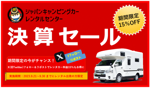 国内レンタルキャンピングカー大手「ジャパンキャンピングカーレンタルセンター(以下 JAPAN C.R.C.) https://japan-crc.com/」を運営するキャンピングカー株式会社(本社:東京都渋谷区、代表取締役社長:頼定 誠)は、2023年9月21日(木)~30日(土)までの間に出発する方限定で、最大15%引きの決算SALEを開催いたします。衝撃プライスでレンタル致しますので、この機会にぜひご利用ください。