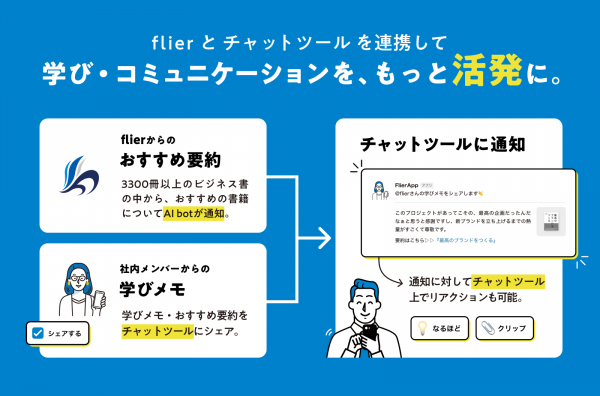 企業内で用いられているチャットツール上にflierのbotアプリを展開。おすすめ要約の提案や学びメモのシェアが可能に。flierサービスコンテンツを媒介として、チャットツール上での社内コミュニケーション活性化、チームの学びのサイクルの促進が可能になります。