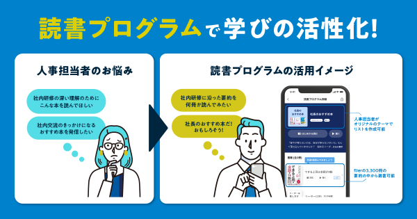 「社長のおすすめ要約リスト」や「社内でいま盛り上がっている話題に関する要約リスト」など、様々なテーマの選書で、企業独自の「読書プログラム」をカスタマイズ。研修内容のさらなる深化・多角化だけでなく、社内交流や読書習慣の醸成につながることが期待できます。