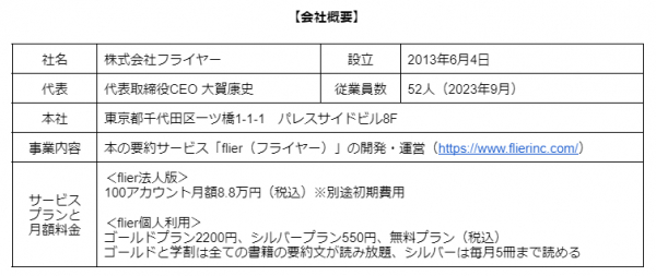 株式会社フライヤーは、本の要約サービス「flier(フライヤー)」を運営する、ITベンチャー(2013年6月設立)です。最大の特長は「書評(レビュー)」ではなく「要約」である点です。書き手の主観が入る書評とは異なり、著者の主張や論理(重要ポイントや全体像)を忠実にまとめ、読者に伝えます。書評でないため、出版社と著者から要約の許可を得る必要があり、要約した原稿にも目を通していただくことで、高品質なサービスを提供しています。