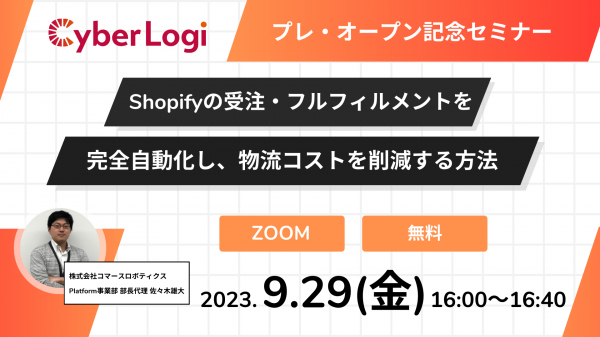 eコマースの自動化型DXサービスを提供する株式会社コマースロボティクス(本社:東京都港区、代表取締役:伊藤彰弘)は、たに始める、次世代型の物流フルフィルメントサービス「サイバーロジ」のプレ・オープンを記念して、2023年9月29日(金)16:00~より無料ウェビナー『Shopifyの受注・フルフィルメントを完全自動化し、物流コストを削減する方法』を開催いたします。
