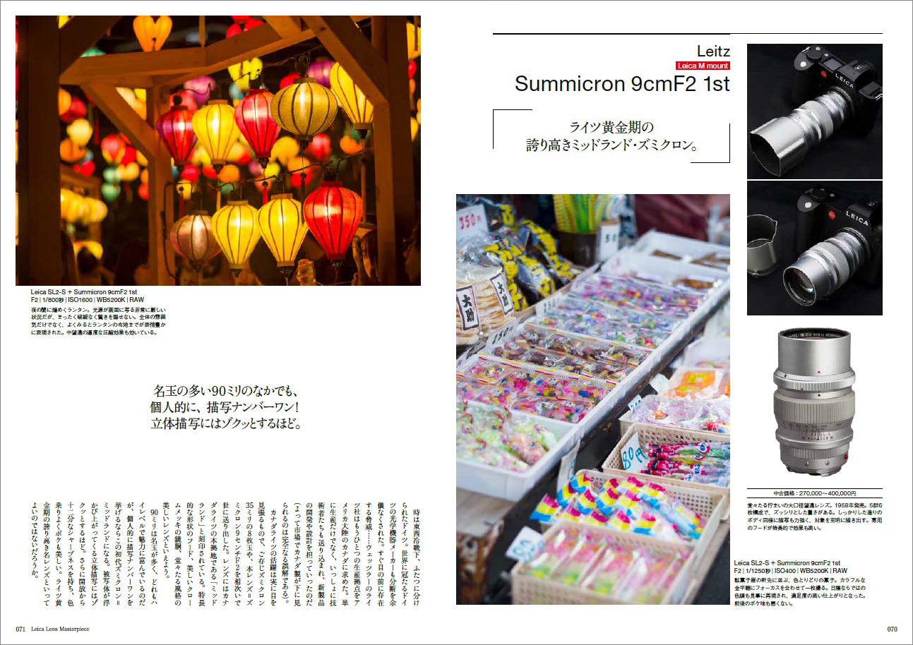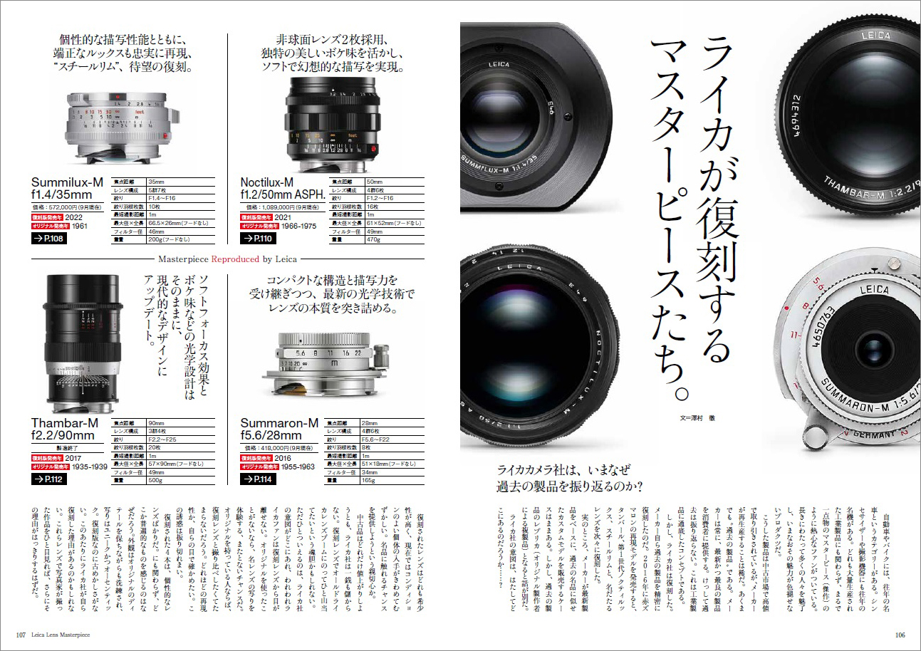 本書はそんな傑作(マスターピース)レンズを網羅した一冊だ。歴史的蘊蓄はもちろんのこと、写真家による描写解説に加えて、なぜそのレンズを手にしたのか、そのレンズとどう付き合っているのか、といった“レンズ体験”まで、愛情たっぷりに語りつくす。