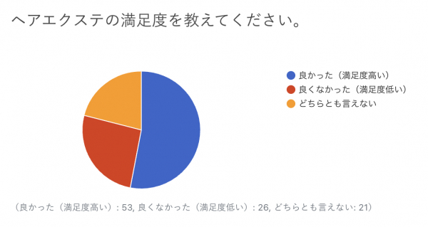 ヘアエクステの満足度について、“高い”が53%、“低い”が26%、“どちらとも言えない”が21%という結果でした。