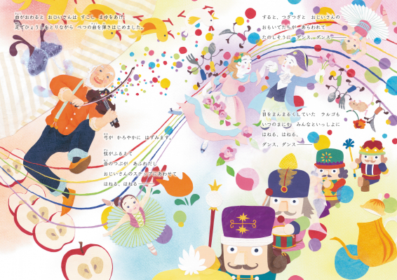 おじいさんが演奏をはじめると、音のつぶがあふれだし