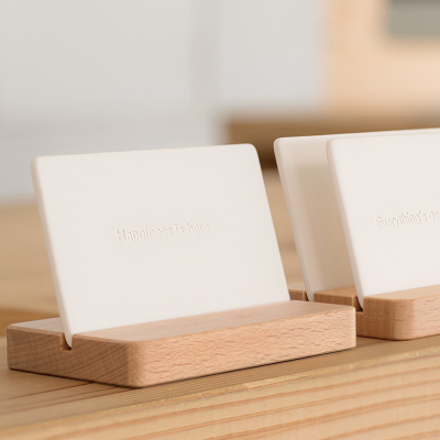 白雲陶器と呼ばれる土を使用して作られたカード形のアロマディフューザーと、木製のスタンドがセットになったシリーズです。白雲陶器は瀬戸で開発された陶土で、石灰質を多く含み、白さが美しく、軽くて吸水性があります。ディフューザーには刻印によってメッセージが入っています。