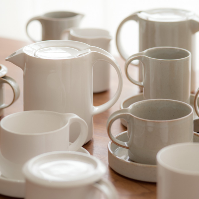 ハンドルからボディが流れるようにつながったフォルムが特徴の食器シリーズです。モデラートとは、音楽記号で「ちょうどよい早さ」を表す言葉。急ぎ過ぎず、遅過ぎず、適度なテンポの暮らしを器とともに過ごしてほしいというデザイナーの思いが込められています。