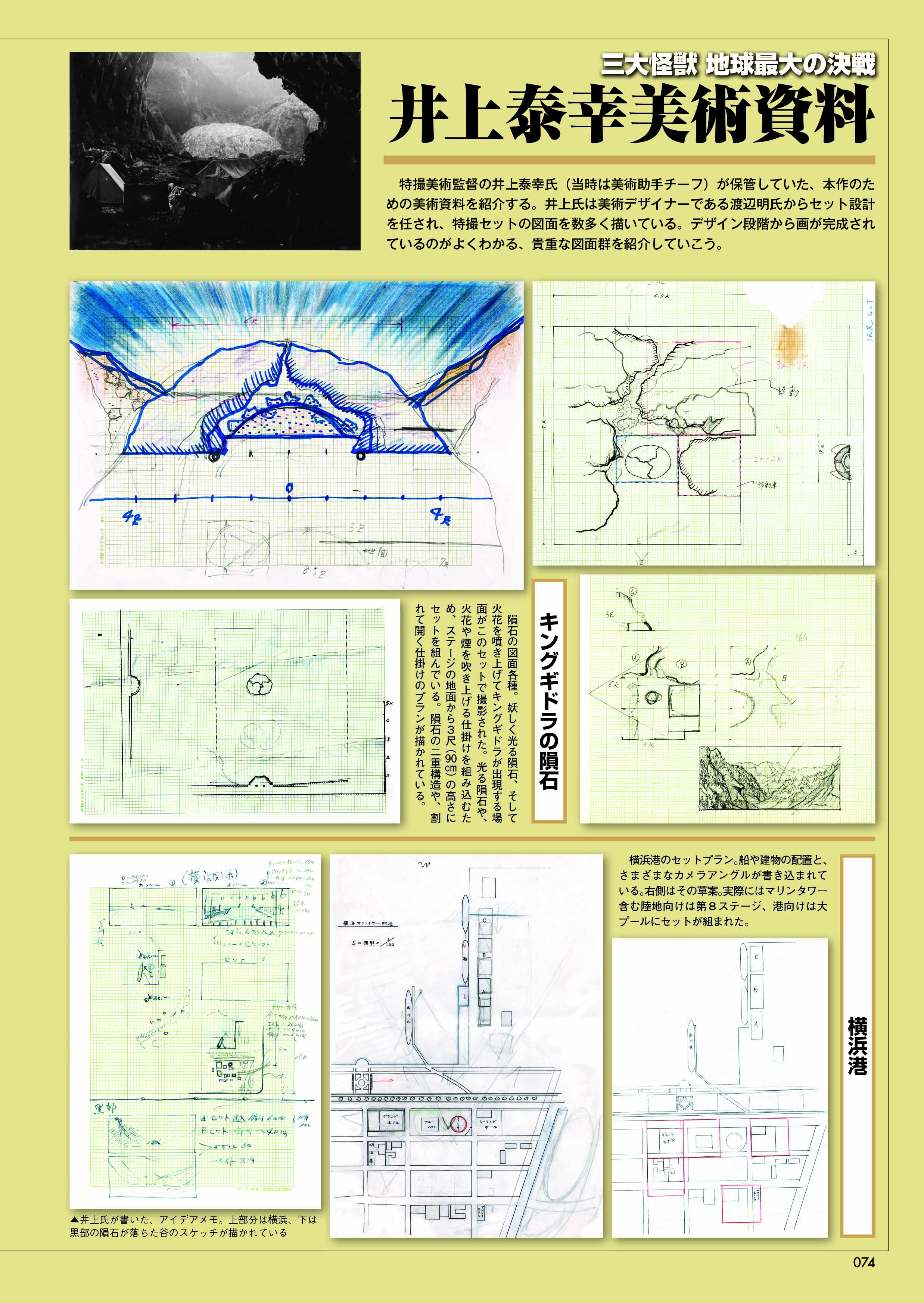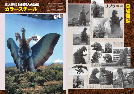 『三大怪獣 地球最大の決戦』の貴重な多数のスナップや、厳選した貴重なカラースナップ等によるグラビアページをはじめ、検討稿、準備稿、決定稿の3種シナリオを一挙大掲載!その他にも、作品製作の経緯を追求したプロジェクト、多彩なキャストやスタッフのインタビュー、作品データ、撮影スケジュール、ロケ地ガイド、宣材やプロップ紹介、豪華なライター陣ならではの豆知識を集めたコラムなど、ゴジラファン注目の内容でお届けいたします。