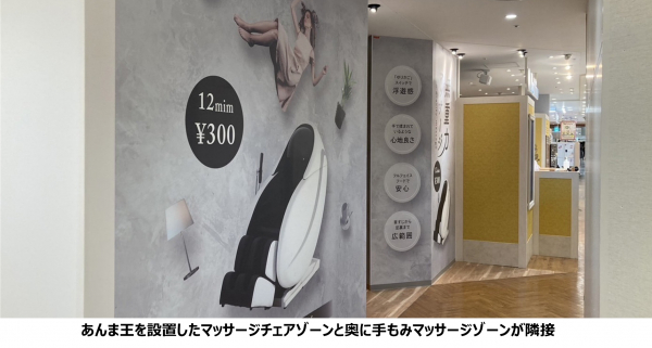 アイオイメディックホールディングス株式会社(所在地:神奈川県藤沢市、代表取締役:城田 裕之)の子会社、株式会社日本メディック(所在地:神奈川県藤沢市、代表取締役:城田 充晴)が企画・開発し、業務用として国内トップシェアを誇るマッサージチェア「あんま王」が、9月14日(木)オープンのリラクゼーションスペース「ラフィネ」セレオ国分寺店に3台導入されました。かつて手もみマッサージとの利用者の奪い合いを懸念され、同エリアでの設置が敬遠されていたこともある業務用マッサージチェアですが、近年では利用者の選択肢の1つとして導入するリラクゼーション施設も増加しています。利用者のさまざまな事情やニーズに応える選択肢を提供することで、相互送客・新規ターゲットの獲得・混雑時の利用機会損失の防止にも繋がっています。