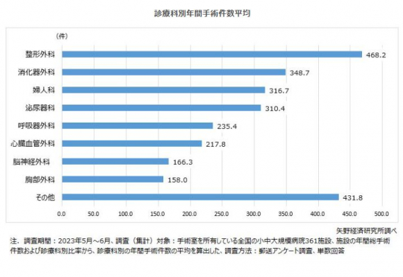 さらに総手術件数に対する診療科別の割合を尋ね、診療科別年間手術件数の平均を算出した。診療科別の年間手術件数をみると、最も高いのは「整形外科」の468.2件、続いて「消化器外科」348.7件、「婦人科」316.7件、「泌尿器科」310.4件の順になっている。一方、最も低いのは「胸部外科」の158.0件、続いて「脳神経外科」の166.3件、「心臓血管外科」の217.8件という結果になった。