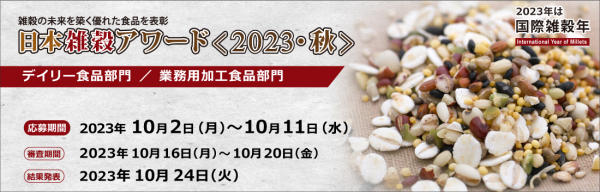 雑穀の普及に取り組む一般社団法人日本雑穀協会は、10月2日(月)~11日(水)の期間中、健全な雑穀の市場形成を目的として実施している表彰制度「日本雑穀アワード」において、2023年秋の『デイリー食品部門』、及び『業務用加工食品部門』の応募商品の募集受付をいたします。