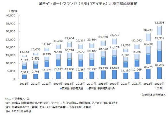 2023年は社会全体がコロナ禍前に急速に戻っており、コト消費(体験型消費)に合わせてモノ消費(商品やサービスへの消費)も発生している。現下、インポートブランド市場を支える国内富裕層については、依然として旺盛な消費が継続しているが、加えてインバウンド(訪日外国人客)需要が戻ってきたことで、同市場は前年を上回る好調さがみられる。主に懸念されるのは、一般の国内消費の低調さだが、2023年はインバウンド需要も活発化していることから、同年の国内インポートブランドの小売市場規模は前年比16.3%増の3兆3,594億円を予測する。