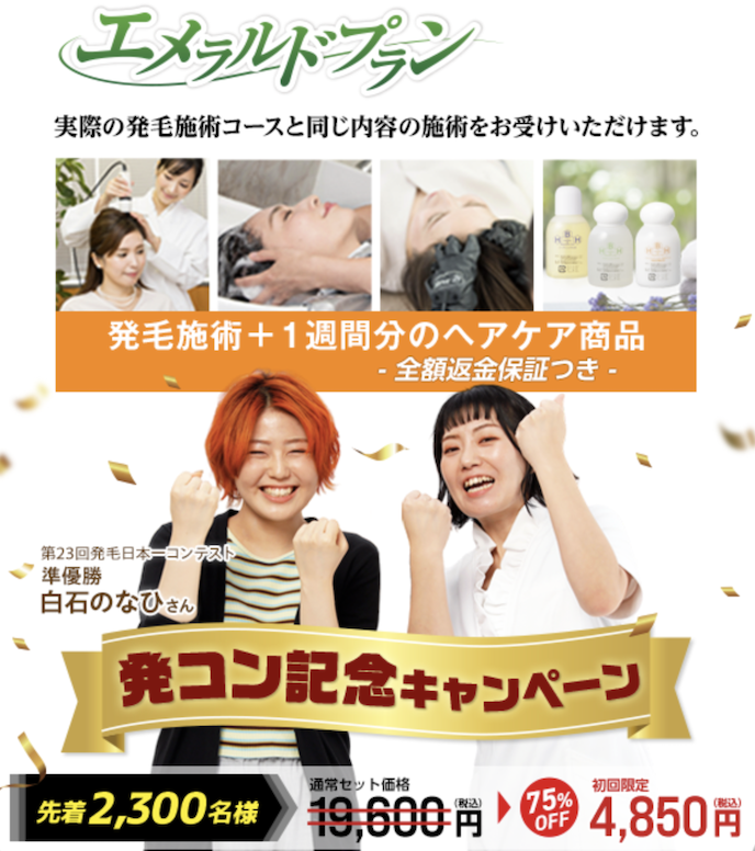 リーブXおよびエメラルドプラン(女性専用)は、リーブ21の発毛施術を受けられるほか、発毛診断や改善のためのアドバイスを約2時間で体験できるプラン。さらにリーブ21の頭皮ケア商品3点セット(3,740円相当)がついています。