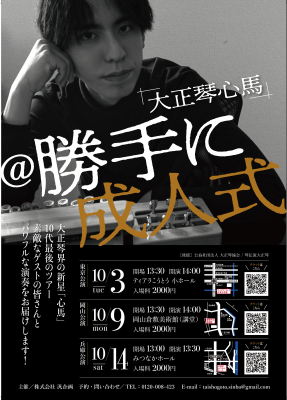 大正琴アーチスト「心馬」が10代最後のツアーを敢行します。(イベント主催・株式会社汎企画)東京・岡山・兵庫の3箇所で素敵なゲストの皆さんとパワフルな演奏をお届けします。
