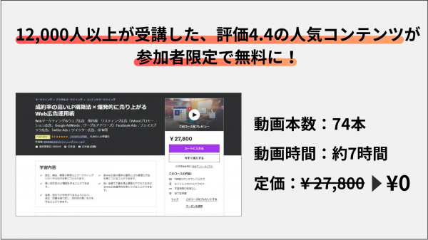 本セミナーにご参加いただいた方への特典として、登壇者である勝原氏が講師を務めるUdemyの動画コンテンツ『成約率の高いLP構築法 × 爆発的に売り上がるWeb広告運用術』