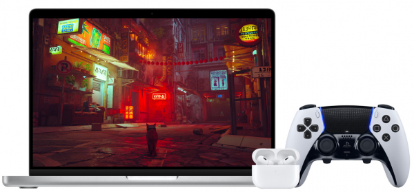 ゲームモードでは、MacのCPUとGPUが自動的にゲーム最優先でパワーを発揮。バックグラウンドタスクによる使用率を下げます。さらに、AirPodsやお気に入りのコントローラといったワイヤレスアクセサリのレイテンシを大幅に低減させるので、反応の良さを感じられます。