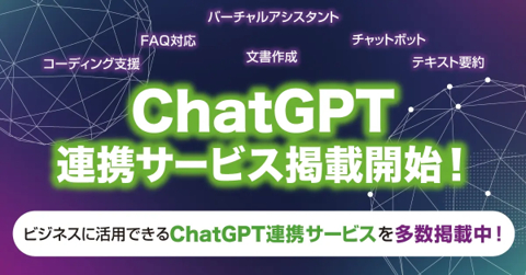 AIポータルメディア「AIsmiley」は、ChatGPTと連携したサービスの掲載を開始いたしました。ChatGPTと連携した「チャットボット」や「テキスト要約」、「コピー作成」、「FAQ」、「コーディング支援」、「文書作成」等のサービスをビジネス利用毎に揃え掲載しております。ビジネスで活用することができるChatGPT連携サービスについて知りたい方は、ご相談いただければと思います。