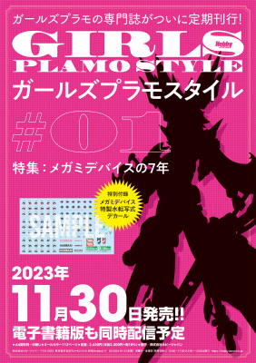 美少女プラモ専門誌「ガールズプラモスタイル」の第1号「ガールズプラモスタイル #1 特集:メガミデバイスの7年」が2023年11月30日(木)に発売!本書だけの特別付録として「メガミデバイス特製水転写式デカール」が付属!ご期待ください!