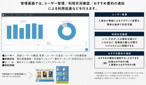 管理画面は、権限を付与された「管理者」のみが確認できる画面。ユーザー管理、利用状況の確認、おすすめ要約の通知による利用促進が可能。
