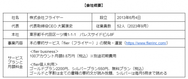株式会社フライヤーは、本の要約サービス「flier(フライヤー)」を運営する、ITベンチャー(2013年6月設立)です。最大の特長は「書評(レビュー)」ではなく「要約」である点です。書き手の主観が入る書評とは異なり、著者の主張や論理(重要ポイントや全体像)を忠実にまとめ、読者に伝えます。書評でないため、出版社と著者から要約の許可を得る必要があり、要約した原稿にも目を通していただくことで、高品質なサービスを提供しています。