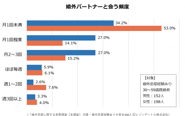 ・婚外パートナーと会う頻度は「月1回未満」が最多。特に女性では5割以上!