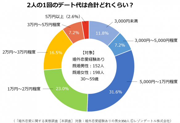 ・婚外デートの1回のデート代(2人分)の合計は5,000円~1万円程度が最多で約3割