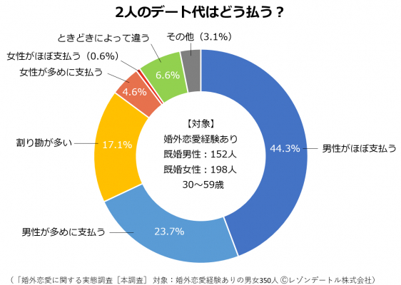 ・婚外デートの費用は「男性がほぼ支払う」が5割弱。割り勘は2割に満たない