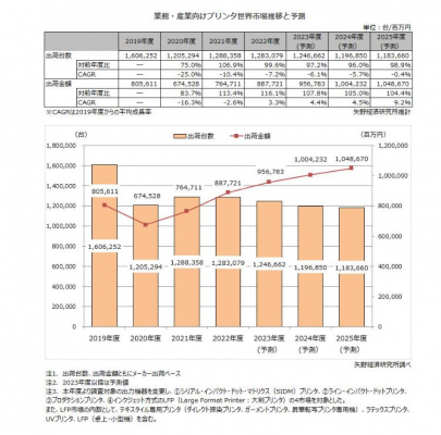 2023年度の業務・産業向けプリンタ世界出荷台数は、前年度比97.2%の124万6,662台、出荷金額は同107.8%の9,567億8,300万円になると予測する。